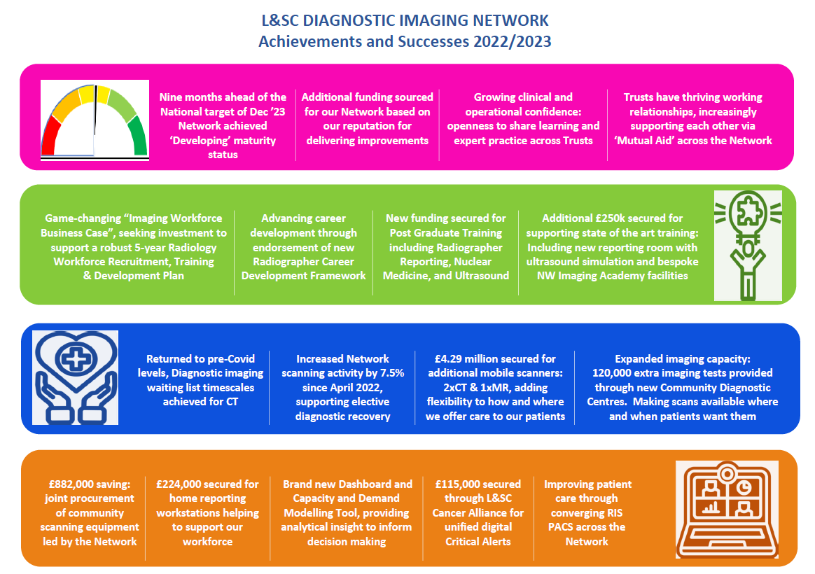 Following a successful 2022/2023, the imaging network programme team and our four provider trusts continued working closely together during 2023/24, to deliver collaborative projects, share best practice and provide support across organisations to problem-solve and deliver results.